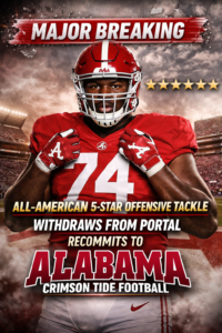 Major breaking news has sent shockwaves through the college football world as a highly coveted All-American, 5-star offensive tackle has officially withdrawn from the transfer portal and recommitted to the Alabama Crimson Tide football. In an era where roster movement has become the norm, this decision stands out as a powerful statement of loyalty, belief, and unfinished business in Tuscaloosa.